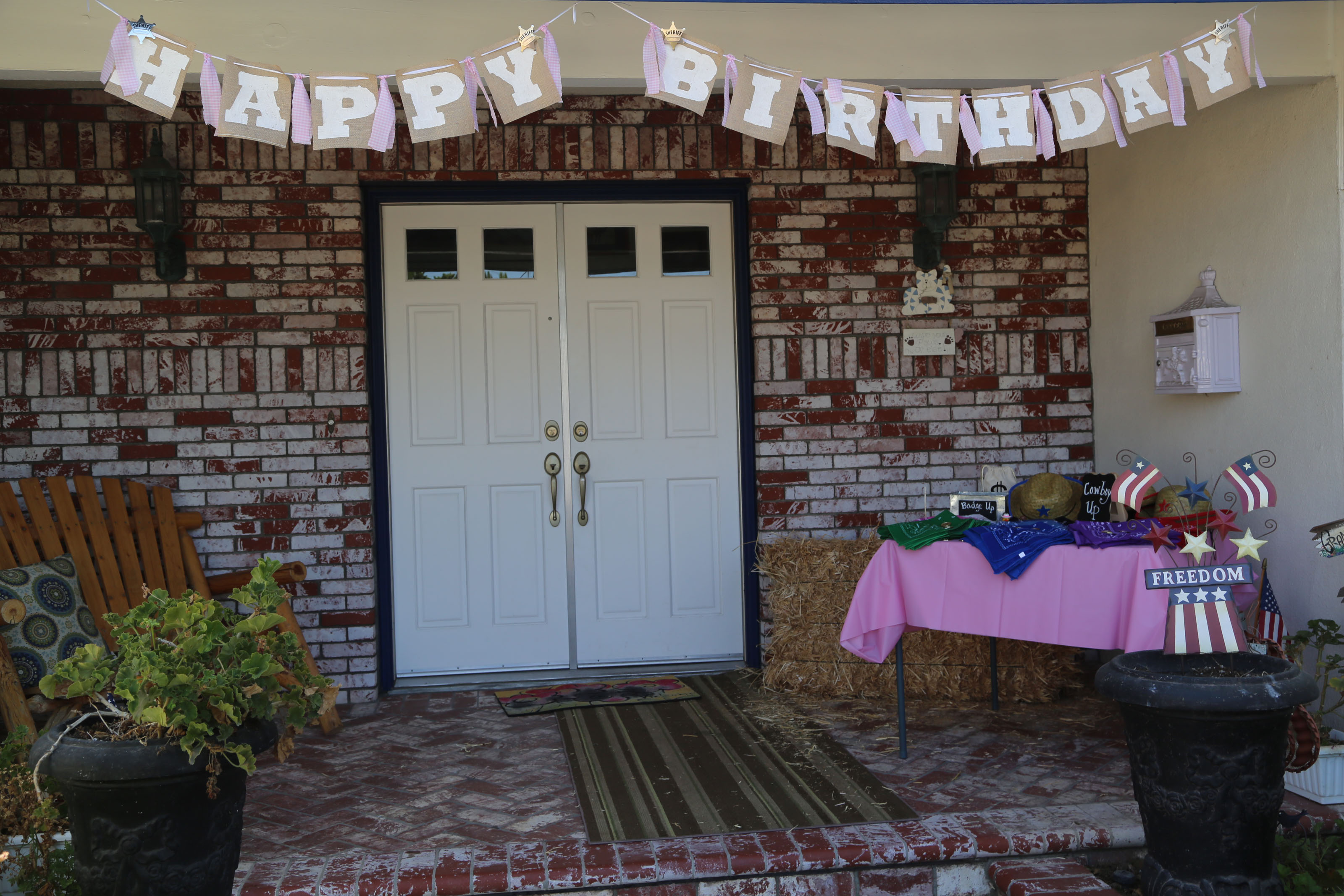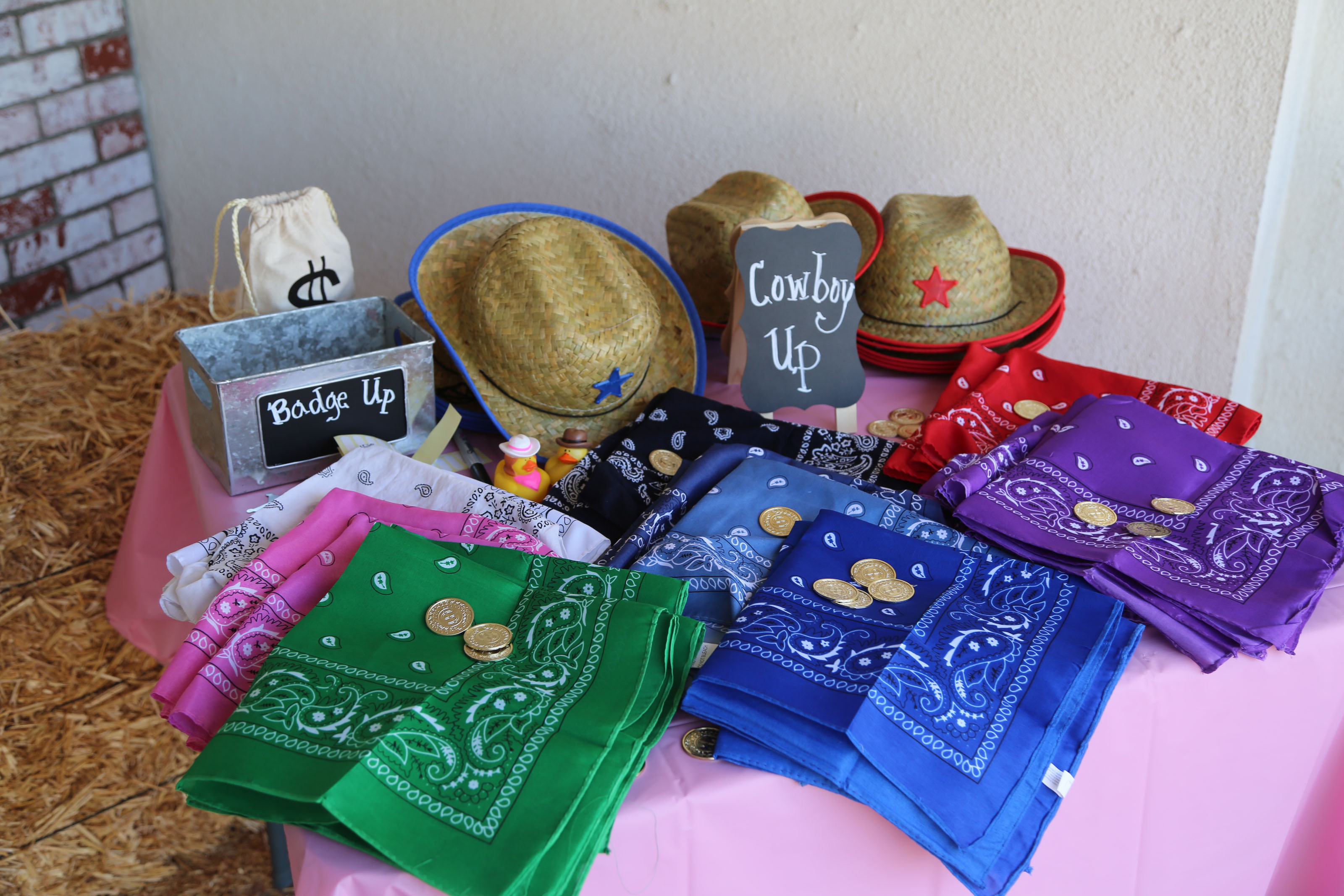 Now we really wanted everyone to Cowboy up at this party! So my mom and I stopped by Party Party on La Palma and Imperial and bought bandanas and decorations(balloons, tablecloths, plates, and cups). I also ordered cowboy hats, sheriff badges, and bandanas from Oriental Trading Co.