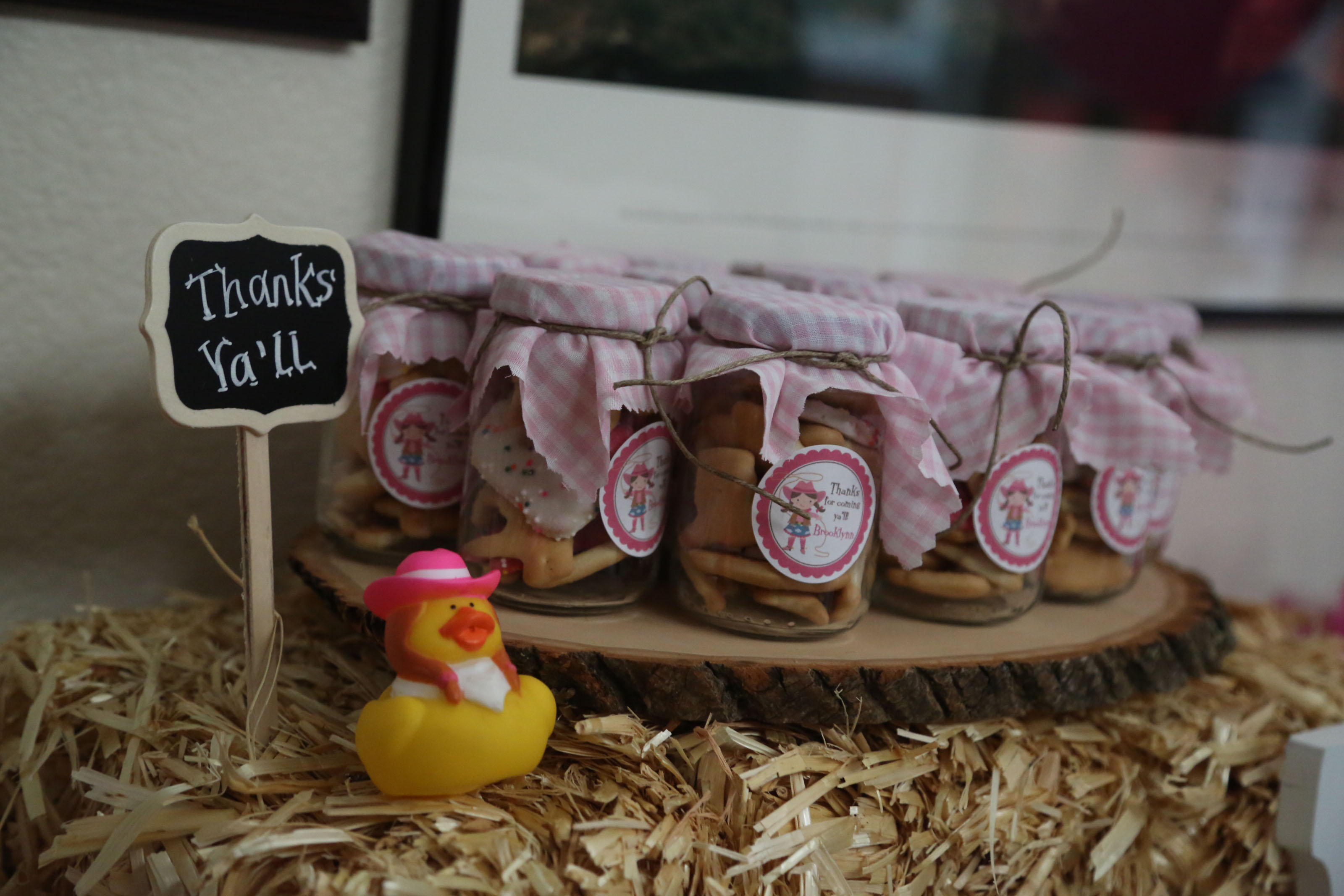 This really helped everyone get in the cowboy theme! Now for party favors I saved a bunch of baby food jars and cleaned all the gunk off with goo be gone and filled them with animal cracks and then used the left over fabric and twine to make them look western. We also bought some bags and filled them with goodies, toys, and press on tattoos for the kiddos.