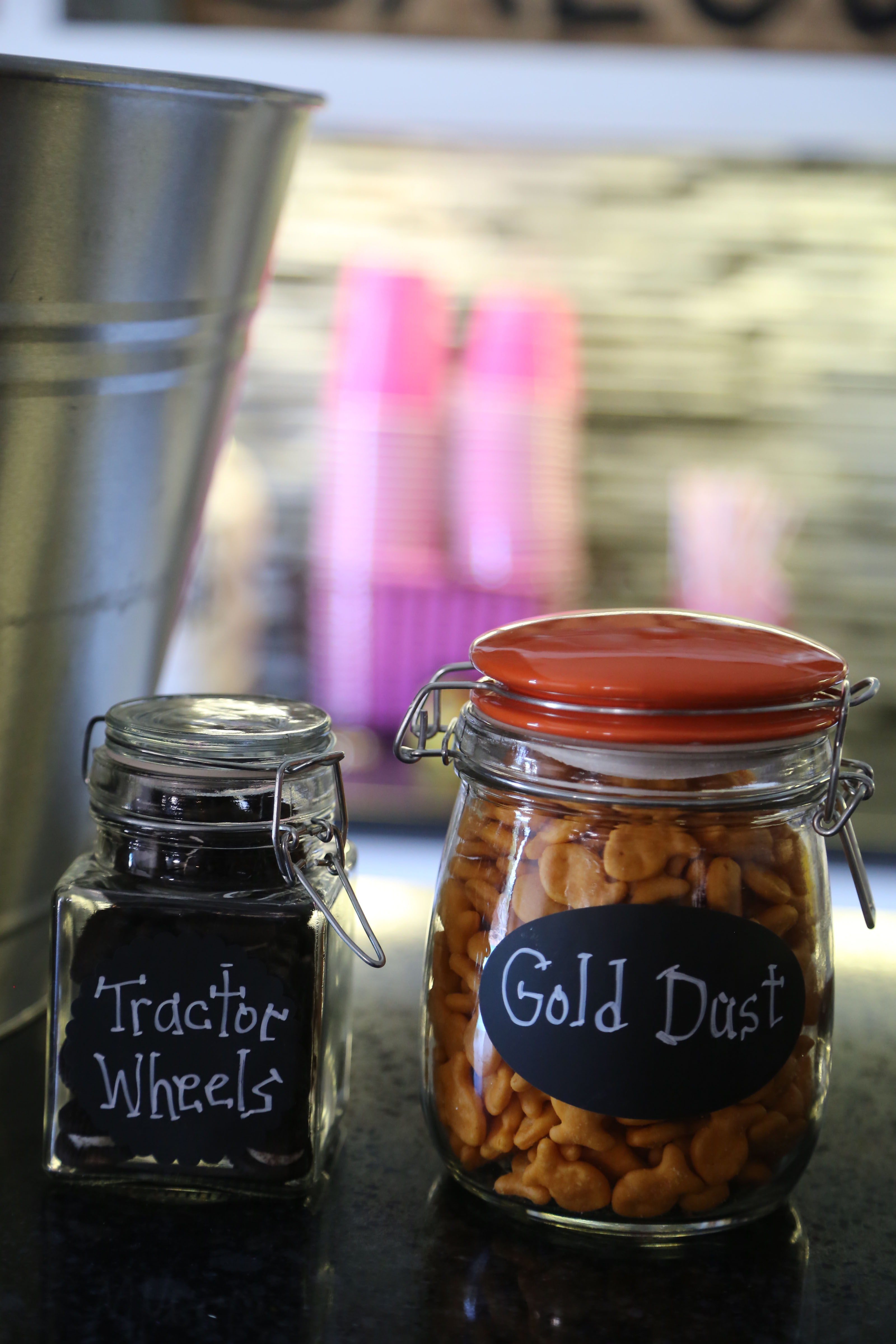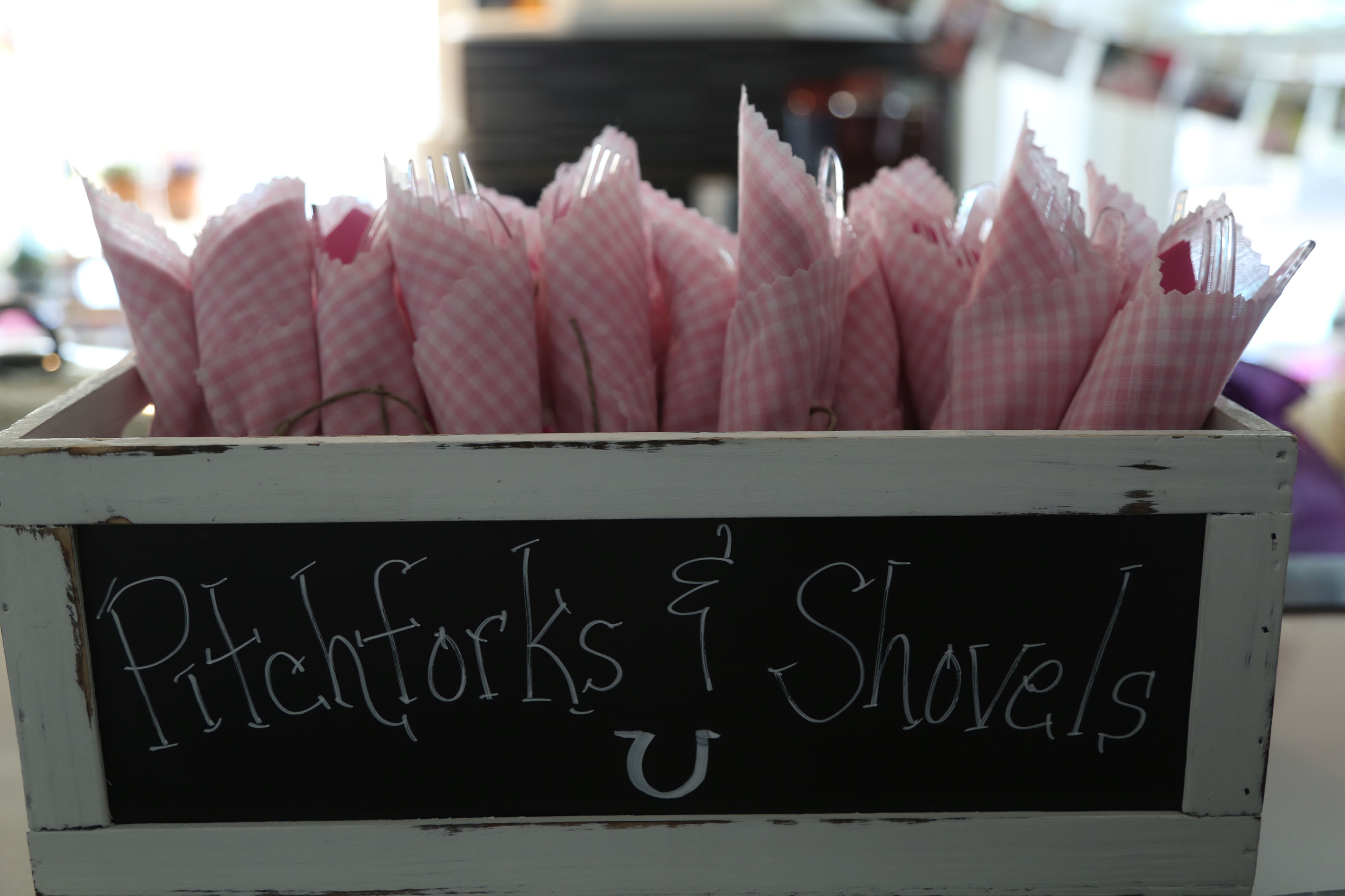 For silverware or as we called it, pitchforks and shovels, I bought plastic utensils, pink napkins, some pink and white checkered fabric and twine. It was really simple to make! I cut the fabric into squares a little bit bigger then the napkin, laid the napkin on top of the fabric then the silverware, rolled it all up and then tied it with the twine. It turned out super cute!